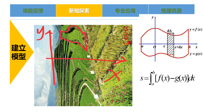 概述本节课为《定积分及其应用》章节的第八节,包括1个模块:定积分的几何应用,共1课时。该课时是利用定积分计算平面图形的面积,这个目标是通过实例提出问题,在引导学生解决专业问题的过程中实现的。 在教学过程中引导学生发散思维,将所学微积分知识与宗地面积问题和