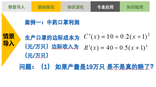 概述本节课为《定积分及其应用》章节的第三节(第四、五课时),为前两次课的概念与性质的升华,分两个模块,1.第一换元积分法2.第二换元积分法。本节课是在自主学习的基础上、通过解决专业实例(中药口罩利润问题),一步步引导学生学习定积分换元法,并将导数的应用、不定积分、定积分的性质的知识充分联系,激发学生的发散思维,将所学微积分知识与专业及当